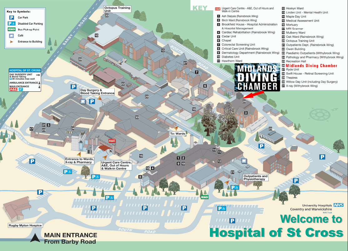 For dive medicals - due to limited parking space directly outside the chamber, non-emergency cases should proceed to the large pay and display car park at the front of the hospital and enquire at the main reception of the hospital for directions to the chamber.